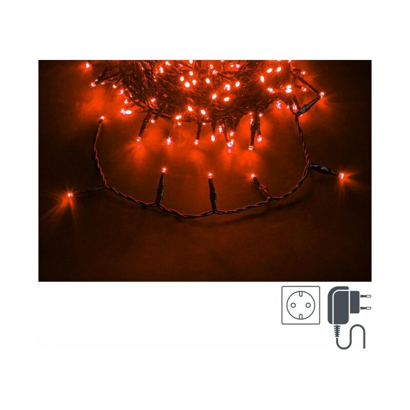 Catena 300led, luce rossa, dimensione led 5mm non sostituibile. filo verde, lunghezza totale filo 17,95mt, lunghezza cavo alimentazione 3mt, lunghezza filo luci 14,95mt. dotato di presa schuko. 8 giochi luce con memory. per uso interno-esterno ip44. con colour box. con trasformatore 31v3.6w.