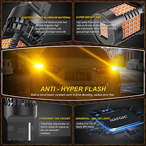NATGIC T20 7440 Lampadine a LED Giallo Ambra, W21W LED CanBus Senza Errori Resistenza di Carico Integrata per Indicatori di Direzione Anteriori o Posteriori - Chip LED da 89 Pezzi 4000LM 21W(2 Pezzi)