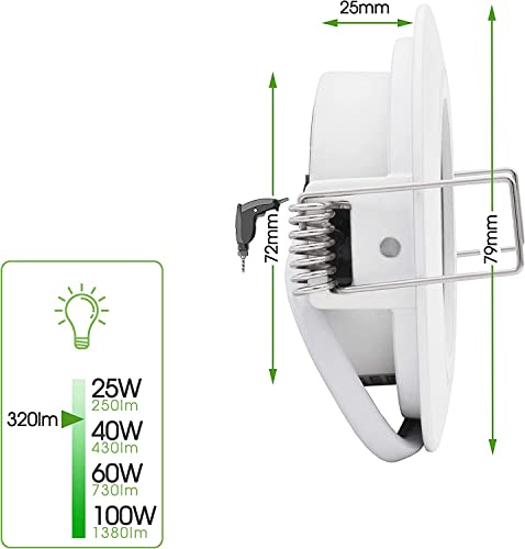 Dimensioni: il faretto è ultrapiatto e ha una profondità di montaggio di 25 mm, un diametro totale di 79 mm e un diametro del foro di 72 mm.