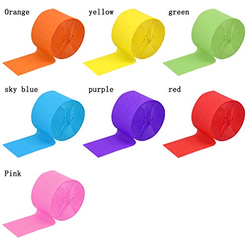 【7 Rotoli di Carta Crepe Colorata】 Un totale di 7 colori di stelle filanti party in rosso, arancione, giallo, verde, blu, viola e rosa. Una varietà di colori sono adatti per le tue diverse feste a tema.