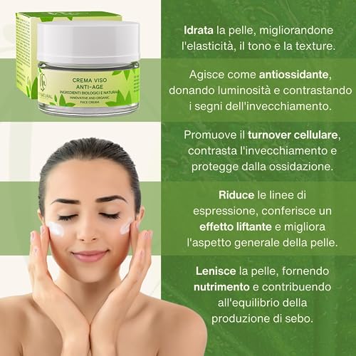 NATY NATURAL Crema Viso Antirughe Idratante Bio, 11 Principi Attivi Acido Ialuronico Aloe Vera, Giorno e Notte, Donna e Uomo Antiage Liftante Made In Italy
