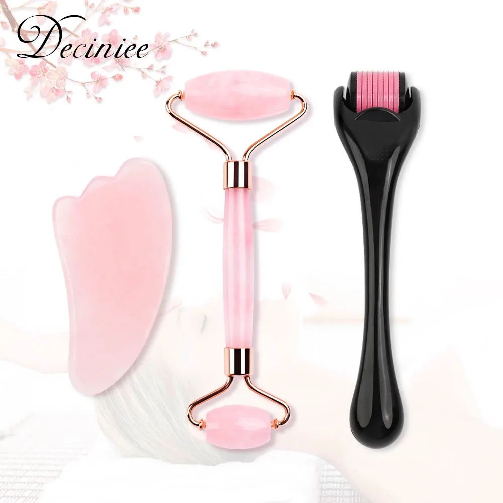 Natural Rose Quartz Jade Roller Facial Eye Body Massager Roller Jade Stone Gua sha Scraper Face Tools with derma roller 0.3mm