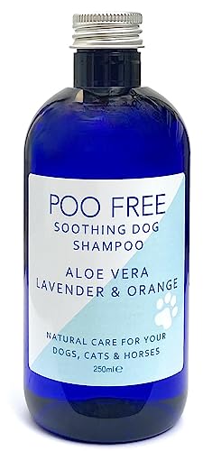 POO FREE 99% Naturale Shampoo LENITIVO per Cani con Aloe Vera, Arancia Dolce & Lavanda. Senza Solfati, Senza Parabeni. Deterge. Allevia Il Prurito, Elimina Odori. per Pelli Sensibili. Concentrato