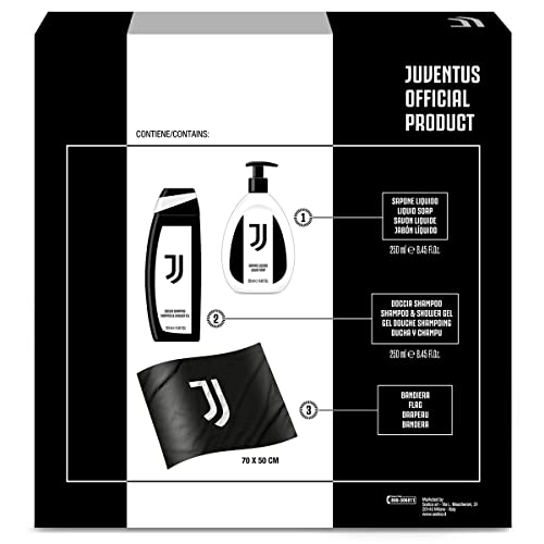NEL SET REGALO: Doccia Shampoo 250ml, Sapone liquido 250ml e la Bandiera della Juventus di dimensioni 70cmx50cm.