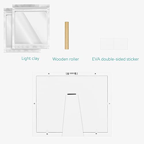 FACILE DA UTILIZZARE: basta stendere l'impasto su una superficie piana, far poggiare mano e piede del bimbo, ritagliare la sagoma e attendere che s'indurisca per almeno 24ore. Incorniciare infine nell'apposita sezione tra vetro e sfondo.