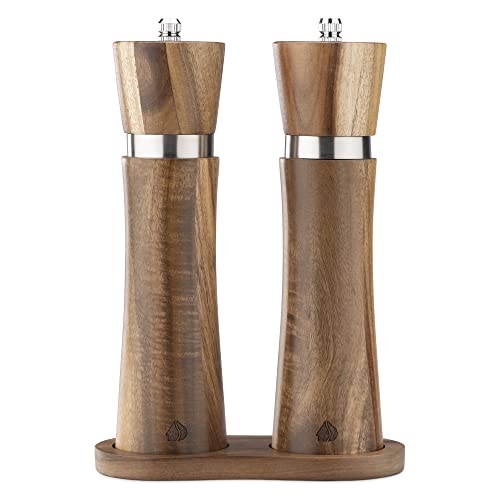 Dettagli: confezione da 2 pezzi / materiali: legno d'acacia, alluminio, acciaio inox, ceramica, ABS / misure: macinini: Ø 5,5 x 21,3 cm / vassoio: 15,3 x 7,3 x 1,2 cm / macinini con viti regolabili