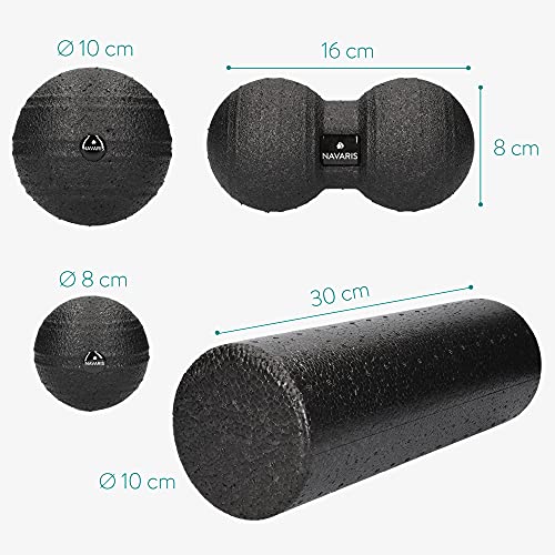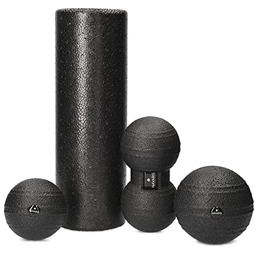 Navaris Set da massaggio 4 pezzi palline e rullo - 2x Sfere Lacrosse 1x Palla doppia Peanut 1x Roll per pilates - Automassaggio Fitness Rilascio Miofasciale