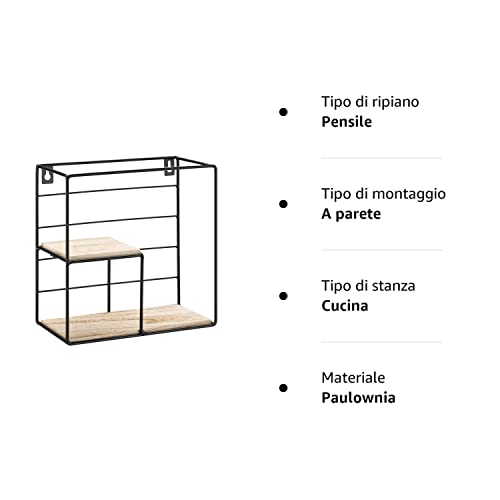 DETTAGLI: la mensolina viene spedita già assemblata - materiali: struttura in ferro con 2x ripiani in legno di paulownia / misure: 22x22x11cm / peso ca. 390g, sostiene un carico di 2.5kg.