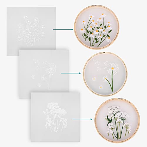 Navaris 3X Kit Ricamo Principianti Punto Croce - 3X Tessuto Trasparente Prestampato Fiori Lato 24,5cm - 3X Cerchi Ø20cm bambù e 9X Filati Colorati
