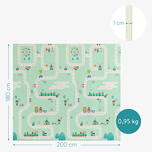 DETTAGLI: il tappetino da gioco ripiegabile con misure di 200 x 180 x 1 cm è realizzato in stabile schiuma XPE con pellicola protettiva in PE. Anti scivolo e waterproof su entrambi i lati. Design: piante e animali / luna park e trenini.