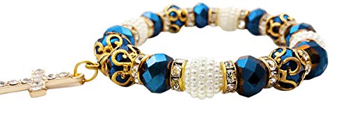 Nazareth Store Braccialetto del Rosario da polso elastico regolabile con croce cristallizzata e perle di cristallo blu profondo