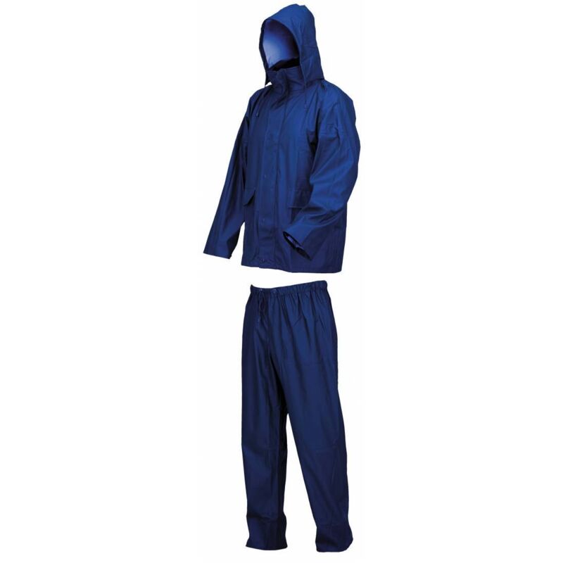 1,0 PZ Di COMPLETO IMPERMEABILE LLUVIA TG.XXXL BLU Mod. LLUVIA in poliuretano-PVC-poliestere. Giacca: cappuccio interno al collo, aerazione sul dorso e sotto le ascelle, chiusura con cerniera in plastica con patta e bottoni, soffietto controvento alla manica, due tasche con pattina anti pioggia, bottoni fondo manica. Coulisse in vita. Pantalone: elastico in vita con coulisse, cerniera al fondo con soffietto. Colore blu. Taglia XXXL