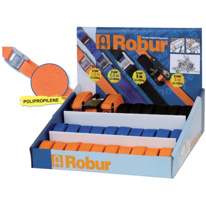 Espositore Composto Da: Art. 8188 F Sistema Di Legatura Ad Anello Lc 200 Kg Con Fibbia Di Serraggio. Nastro Da 25 mm Di Polipropilene Ad Alta Tenacità. ( Lunghezza 150 cm Pz 10- Lunghezza 250 cm Pz 10-Lunghezza 500 cm Pz 6 ) Art. 8188 C Sistema D