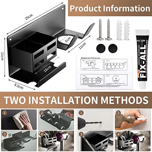NCKIHRKK Porta Asciugacapelli, Porta Phon con Porta Oggetti per Bagno 2 Scomparti in Alluminio e Portacavi, Supporto per Asciugacapelli per Manici di Asciugacapelli Fino a 5cm, Nero