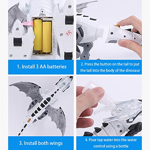 Giocattolo di dinosauro di nebbia magica Spray: il dinosauro può essere spruzzato con luce rossa ogni pochi secondi, proprio come un fuoco dalla sua bocca. C'è un serbatoio dell'acqua incorporato sulla testa, è sufficiente riempire il foro con acqua usando la bottiglia di plastica fornita. Si prega di notare che ogni iniezione dell'acqua può supportare solo alcuni spray causati da restrizioni d'acqua.