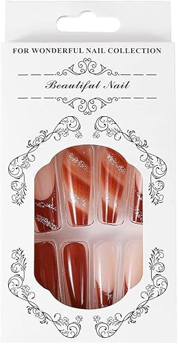 Neckon Unghie finte a forma di bara di San Valentino, colore marrone, lunghe unghie finte a forma di ballerina francese con glitter, in acrilico, copertura completa, per donne e ragazze (24 pezzi)