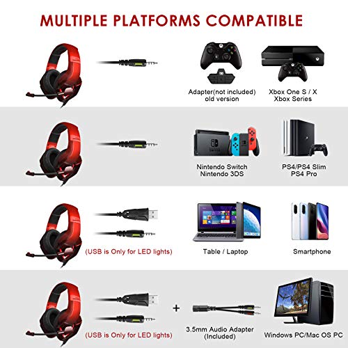 NEEDONE Cuffie da gioco con microfono per PS4 Gamer Headset per PS5 Xbox One Switch PC Fortnite Gaming Mac Laptop K19 Cuffie da Gioco con 3.5mm Jack LED Controllo Volume e Bass Stereo-Rosso