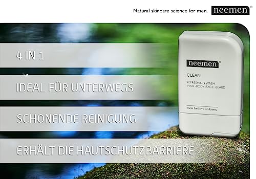 Neemen - CLEAN 4in1 Shampoo per Capelli, Corpo, Viso e Barba - Detergente Multifunzionale per Uomo con Estratto di Neem, Prebiotici e Fico d'India - Idratante, Lenitivo, Rinforzante e Protettivo