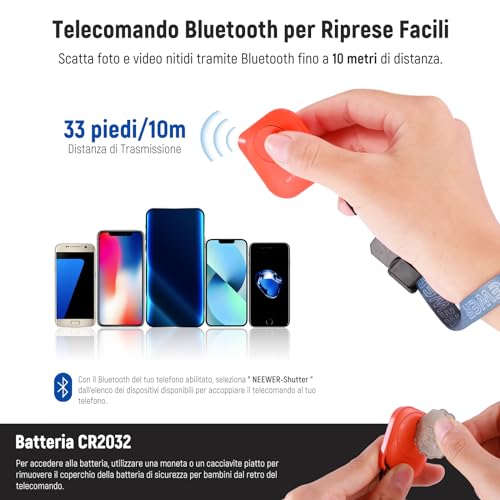 【Telecomando Bluetooth e Coperchio della Batteria Sicuro per i Bambini】 Il telecomando Bluetooth (batteria inclusa) ti consente di scattare foto e video in modalità wireless fino a 33 piedi/10m di distanza. Dotato di un coperchio della batteria sicuro per i bambini, per l'apertura è necessaria una moneta o un cacciavite piatto per accedere alla batteria