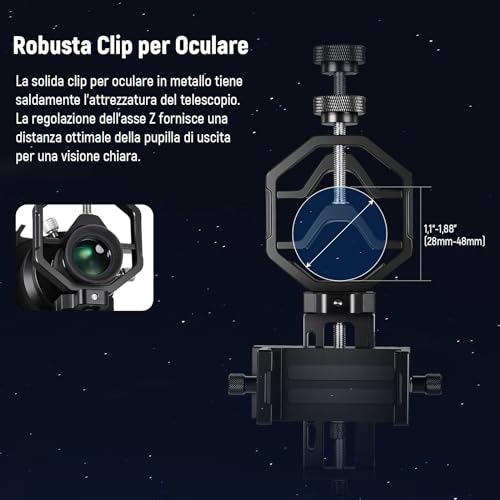 【Astrofotografia con il Tuo Telefono】 Compatibile con la maggior parte dei telescopi con diametro esterno dell'oculare compreso tra 1,18"/30mm e 1,85"/47mm. Questo adattatore telefonico universale per telescopi ti permette di riprendere Saturno, Giove o altri oggetti astronomici semplicemente con il tuo smartphone