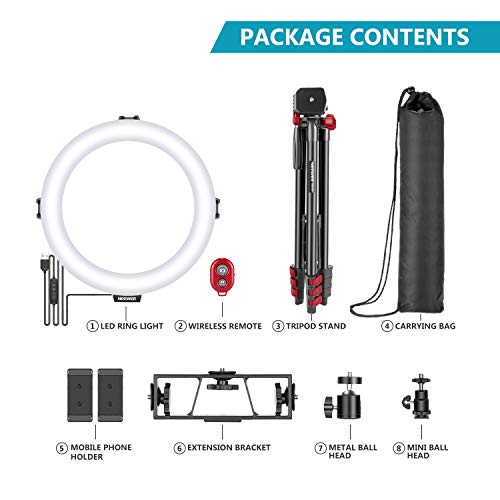 SONO INCLUSI NEL KIT: (1) 8” Luce LED Anulare con 3 Attacchi Coldshoe, (1) 137cm Treppiedi, (1) Staffa di Connessione, (2) Supporto Clip per Smartphone, (1) Testa a Sfera in Metallo, (1) Mini Testa a Sfera, (1) Wireless Telecomando. ATTENZIONE: Gli smartphone NON sono inclusi!