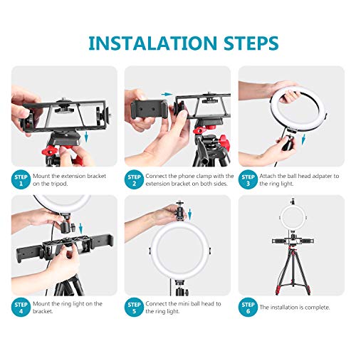 GRAN APPLICAZIONE: Grazie alla testa a sfera, è possibile muovere la struttura liberamente per ottenere vari angoli desiderati. La staffa di connesione è progettata con 2 supporti clip per smartphone, e quindi si può eseguire lo streaming in diretta su YouTube, Instagram, TikTok, Snapchat e FaceTime nello stesso tempo. La luce è pur perfetta per truccatura, spettacoli dal vivo, sel