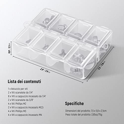 【Cosa Contiene】Il set di viti UA002 include 2 viti scanalate da 1/4", 8 viti a cappuccio incassato da 1/4", 2 viti scanalate da 3/8", 4 viti Phillips M2, 2 viti a cappuccio incassato M2,5, 4 viti Phillips M3, 4 viti a cappuccio incassato M4 e una custodia per il trasporto