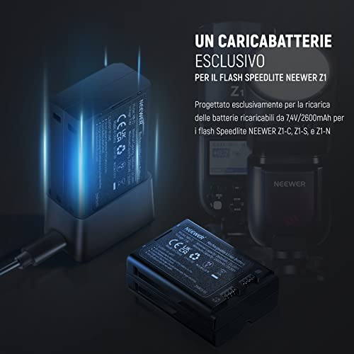 NEEWER Batteria al litio da 7,4 V/2600 mAh e caricatore USB per NEEWER TTL Z1-C Z1-S Z1-N testa rotonda Flash Speedlite, batteria di ricambio al litio DC 5 V/2 A, ingresso 8,4 V/1 A, uscita USB tipo C