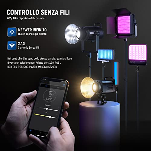 【Controllo App Infinity e 2,4G Incorporato】 Utilizzate l'App NEEWER per regolare dinamicamente le impostazioni di più luci contemporaneamente, fino a 20m e in un massimo di 8 gruppi. La tecnologia NEEWER Infinity consente di controllare simultaneamente fino a 255 dispositivi sull'App. Funziona con NEEWER SL90 RGB1 RGB C80 RGB 1200 MS60B MS60C e CB200B, che possono essere impostati tutti sullo stesso canale per rendere qualsiasi luce nel raggio di 328m un telecomando senza app.