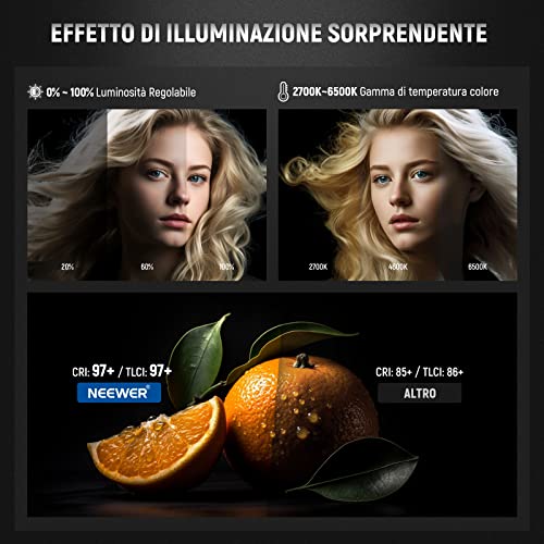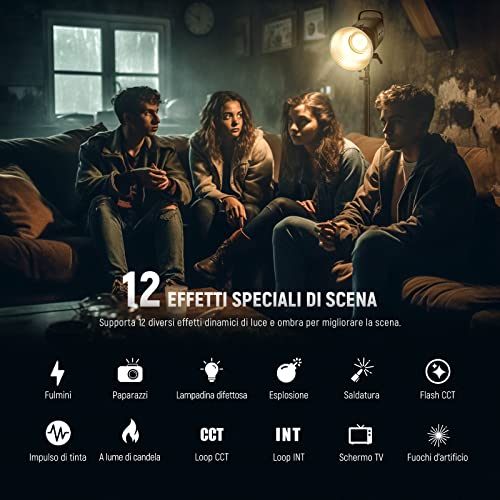 【2700K-6500K CCT e 12 Effetti di Scena】 Offre 2 modalità di illuminazione: Modalità CCT e Modalità Scena. Offre una temperatura di colore di 2700K-6500K, una gamma di regolazione da 0 a 100% e opzioni di luce diurna o più calda per i vostri capolavori creativi. 12 scene di illuminazione personalizzate offrono un'illuminazione realistica durante le riprese, risparmiando molto tempo in post-produzione per gli effetti speciali. CRI 97+ e TLCI 98+ assicurano una riproduzione accurata dei colori.