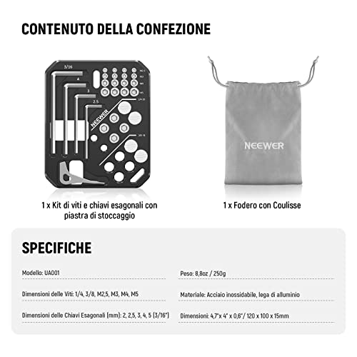 NEEWER Kit di Viti e Chiavi Esagonali con Piastra di Stoccaggio, 5 Chiavi Esagonali e 24 Viti Inox: 3/8" 1/4" M2,5 M3 M4 M5, Compatibile con SmallRig Maniglie Gabbie e Accessori Fotografici, UA001