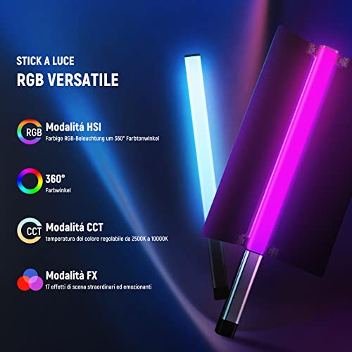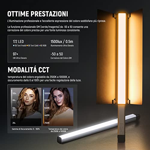 【Stick a Luce RGB Versatile】La Bacchetta Luminosa NEEWER CL124 RGB é fornita di 172 luci a LED (56 bianco freddo, 56 bianco caldo, e 60 RGB), illuminamento da 1500lux/0.5, CRI 97+, e TLCI 97+ per un'illuminazione brillante o neutra. Modalitá CCT/HSI/FX, temperatura del colore regolabile da 2500K a 10000K, e oscuramento da 0 a 100% per una facile regolazione della luminositá