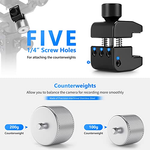 【Bilanciamento preciso】 Cinque fori per viti da 1/4"-20 per fissare i contrappesi. Due contrappesi da 100 g e 200 g ti aiutano a bilanciare con precisione la fotocamera sul gimbal e filmare video cinematici fluidi