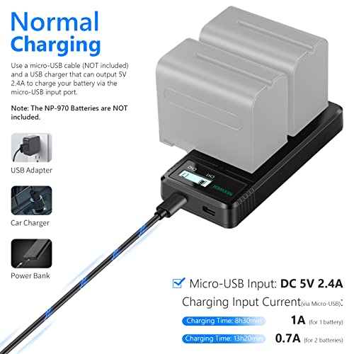NEEWER Doppio Caricabatterie a USB Compatibile con Batterie Sony NP-F970 NP-F960 NP-F950 NP-F930 NP-F770 NP-F750 NP-F570 NP-F550 per Fotocamera, Veloce con LCD Display & Versatili Opzioni di Ricarica