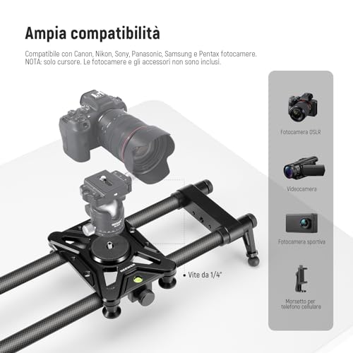 Opzioni di scatto versatili: con filettatura di montaggio da 1/4" e 3/8" sul fondo e su ciascuna estremità, questo cursore può essere montato su un treppiede o un supporto leggero e scattare in orizzontale, verticale o anche con un'inclinazione di 45°. Compatibile con fotocamere DSLR Canon, Nikon, Sony, Panasonic, Samsung, videocamere DV, fotocamere mirrorless, teleobiettivi, smartphone (supporto per telefono non incluso), e molto altro ancora
