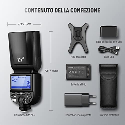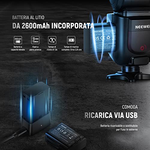 【Capacità Elevata e Riciclo Rapido】La batteria al litio da 7,4V e 2600mAh (NB-Z1) ha un tempo di ricarica completa di circa 2 ore e 15 minuti e può fornire 480 flash a piena potenza con un tempo di riciclo rapido di 1,5 secondi. La durata del flash è compresa tra 1/180s e 1/20000s, assicurando una migliore esperienza di ripresa