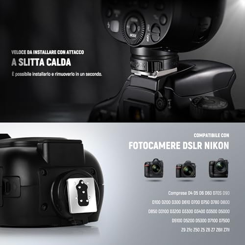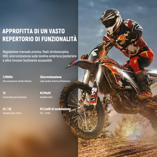 【Prestazioni Avanzate】 Dotato di una potente uscita da 76Ws, offre flash automatico TTL, flash manuale, flash stroboscopico e modalità slave ottica (S1/S2). Grazie alla sincronizzazione ad alta velocità fino a 1/8000s e alle opzioni di sincronizzazione prima tendina/seconda tendina. È possibile usufruire di funzioni aggiuntive come la compensazione dell'esposizione del flash (FEC), il bracketing dell'esposizione del flash (FEB), e molto altro ancora.