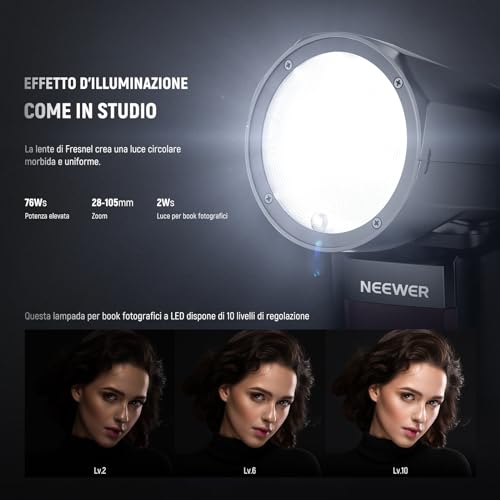 【Effetto d'Illuminazione Naturale e Sorprendente】 Il flash NEEWER Z1-N vanta una testa di fresnel circolare che assicura una distribuzione uniforme della luce, creando una morbida caduta ai bordi. Con una temperatura di colore stabile di 5600K (+/-200K), offre un'illuminazione costante. Lo zoom del flash (28-105mm) può essere impostato automaticamente o manualmente. La lampada da modellismo a LED da 2W incorporata offre 10 livelli di luminosità regolabili, da 01 a 10.
