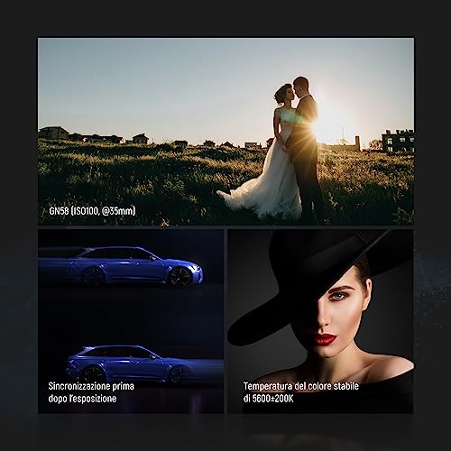 [Prestazioni Ottimizzate] Si tratta di un flash potente con GN58 elevato (ISO100, @35mm), potenza di 200W regolabile in 8 livelli da 1/128 a 1/1 e durata del flash breve di 1/15380 secondi. La batteria da 14,4V 3200mAh offre 500 lampi flash a potenza piena con ricarica veloce di 0,01-1,8 secondi. Gli sfiati su entrambi i lati protegono il flash dal surriscaldamento e aiutano a prolungare la durata di servizio.