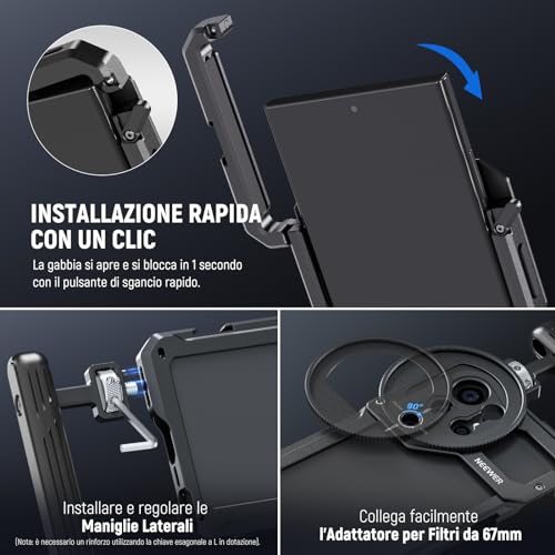 【Installazione Facile e Accesso Completo con Un Solo Clic】 La gabbia telefonica integrata per la S23 ULTRA si apre e si blocca in modo sicuro con un pulsante laterale, fornendo un adattamento preciso senza bloccare l'obiettivo della fotocamera o i tasti funzione. È compatibile con gli obiettivi Moment tramite l'attacco M ed è possibile acquistare un backplane separato PA033 con filettatura da 17mm per la serie di obiettivi NEEWER da 17mm (grandangolo, macro, teleobiettivo, microscopio, ecc.).