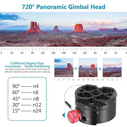 ROTAZIONE ORIZZONTALE A 360 GRADI: La testa a sfera sull'orizzontale supporta il movimento di panoramica a 360 gradi con precisione calibrata per catturare immagini panoramiche sovrapposte in direzione orizzontale. 5 incrementi di arresto in gradi diversi: 15°/30°/45°/ 60°/90°, si ferma intorno a n24/n12/n8/n6/n4. Non è necessario guardare in basso la scala durante le riprese.