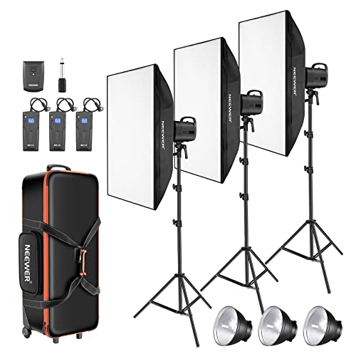 Neewer Kit d' illuminazione stroboscopica per studio fotografico da 900W: (3)Monolight S101 300W 5600K, (3)Supporto, (3)Softbox, (1)Trigger RT-16, (2)Ricevitore, (1)Trolley Carry Bag per Studio