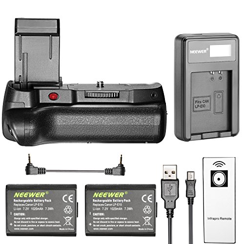 Neewer Impugnatura Portabatteria Verticale per Fotocamere Canon 1100D 1200D 1300D / T3 T5 T6 con Telecomando a Infrarossi & 2pz Batteria 1020mAh Ricaricabile di Ricambio per Canon LP-E10 con Caricabatterie a Micro USB
