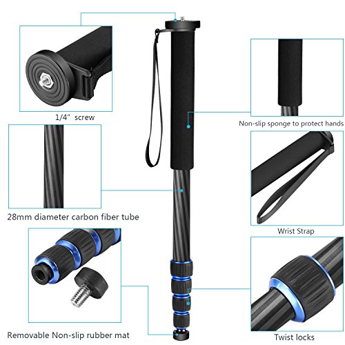 Neewer Monopiede in Fibra di Carbonio, 5 Sezioni 48 - 163 cm, Supporto Regolabile Portatile con Borsa da Trasporto Incluso per Nikon, Pentax, Sony e Opympus DSLR, Nero/Blu