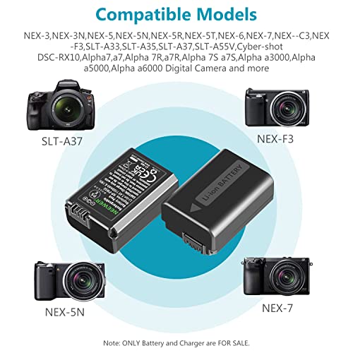 NEEWER NP-FW50 Caricabatterie per Fotocamera Set per Sony ZV-E10, A7, A7R, A7RII, A7II, A7SII, A7S, a6300, a6400, a6500, RX10 Series (2 Pz 1100 mAh, Micro USB e Ingresso Tipo-C Dual Caricabatterie)