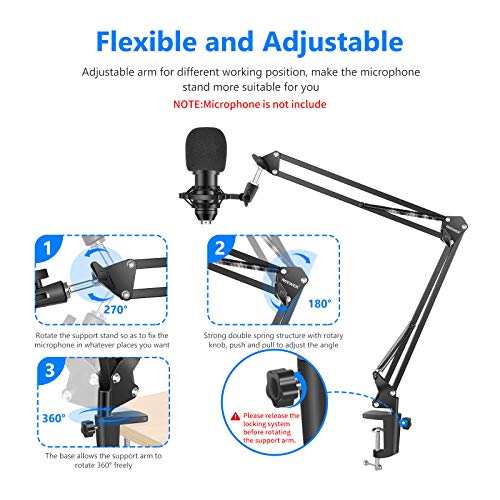 Il Carico Massimot:1 KG.Sono inclusi nel kit: (1) NB-35 Stand Nero per Microfono Asta di Sospensione Braccio a Forbici con (1) Supporto Clip + (1) Serratura da Tavolo + (1) NW(B-3) Filtro Pop Anti-vento. Il microfono, il supporto anti-vibrazione e il cavo audio NON sono inclusi!