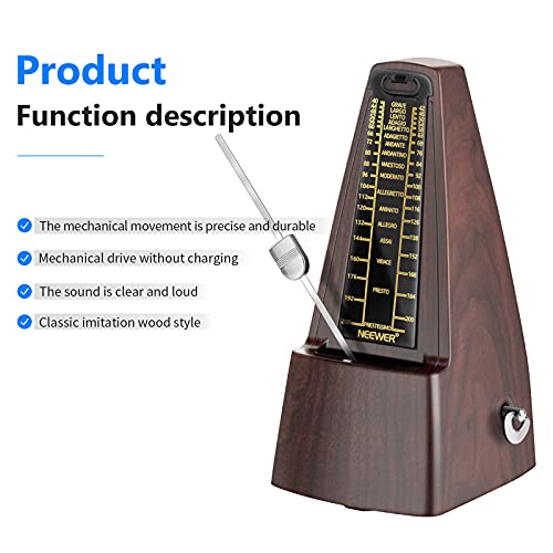 Attrezzo efficace di pratica: iniziate a padroneggiare le abilità del suonare e migliorare il senso del ritmo e del tempo praticando con l'aiuto del nostro metronomo meccanico. Il metronomo produce un suono chiaro e forte per l'utilizzo quando si pratica gli strumenti come pianoforte, violino, chitarra, basso e tamburo ecc..