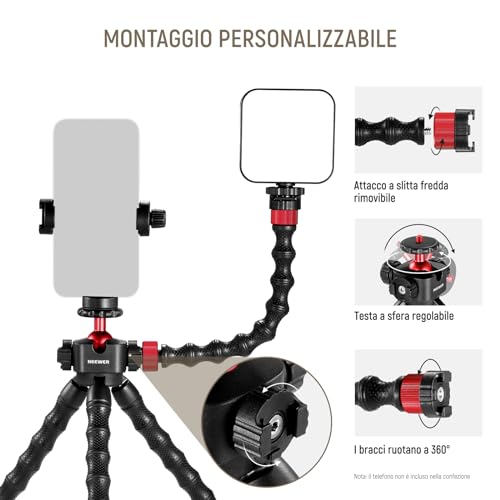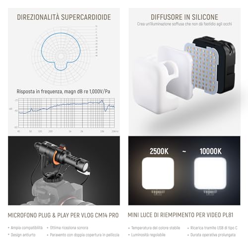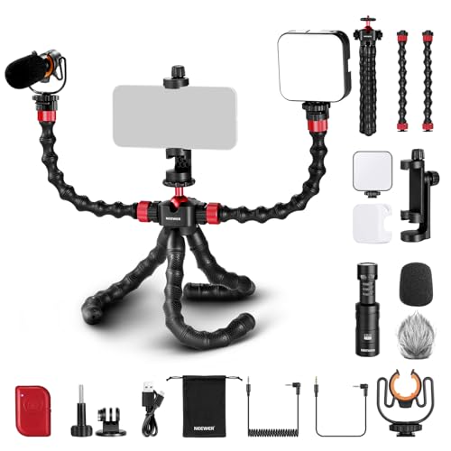 NEEWER Phone Vlogging Set con CM14 Pro Mic, PL81 Luce, T90 Flessibile Treppiede con 2 Magic Arms rimovibili, Bluetooth FB./Clip telefonica/adattatore compatibile con GoPro iPhone 14 13 Pro, carico