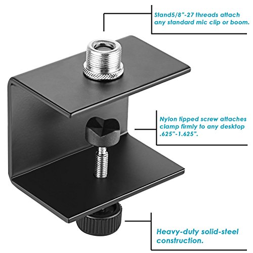 La clip in acciaio resistente e solido provvede un modo forte ed affidabile per sostenere lo stand di microfono. La vite con punta in nylon protegge la superficie del tavolo da graffi.