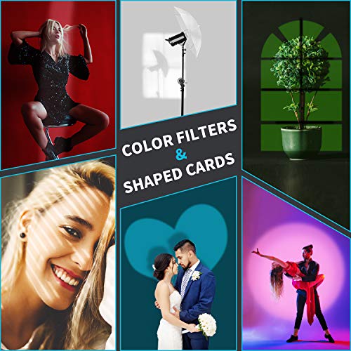 FILTRI COLORATI & SCHEDE GRAFICHE: I 5 filtri colorati (giallo, rosso, rosa, blu, verde) creano le differenti effetti d'illuminazione a colori a diverse temperature di colore. Le 9 schede grafiche possono essere posizionate nella fessura dello snoot per produrre le varie immagini, che rendono la fotografia o il video più affascinante.
